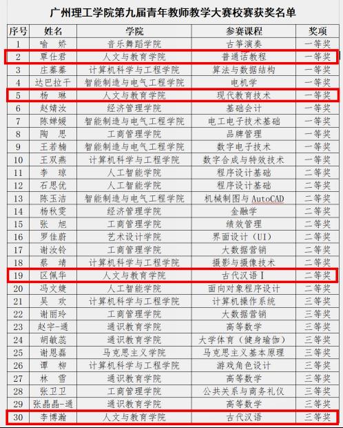 广州理工学院第九届青年教师教学大赛校赛获奖名单