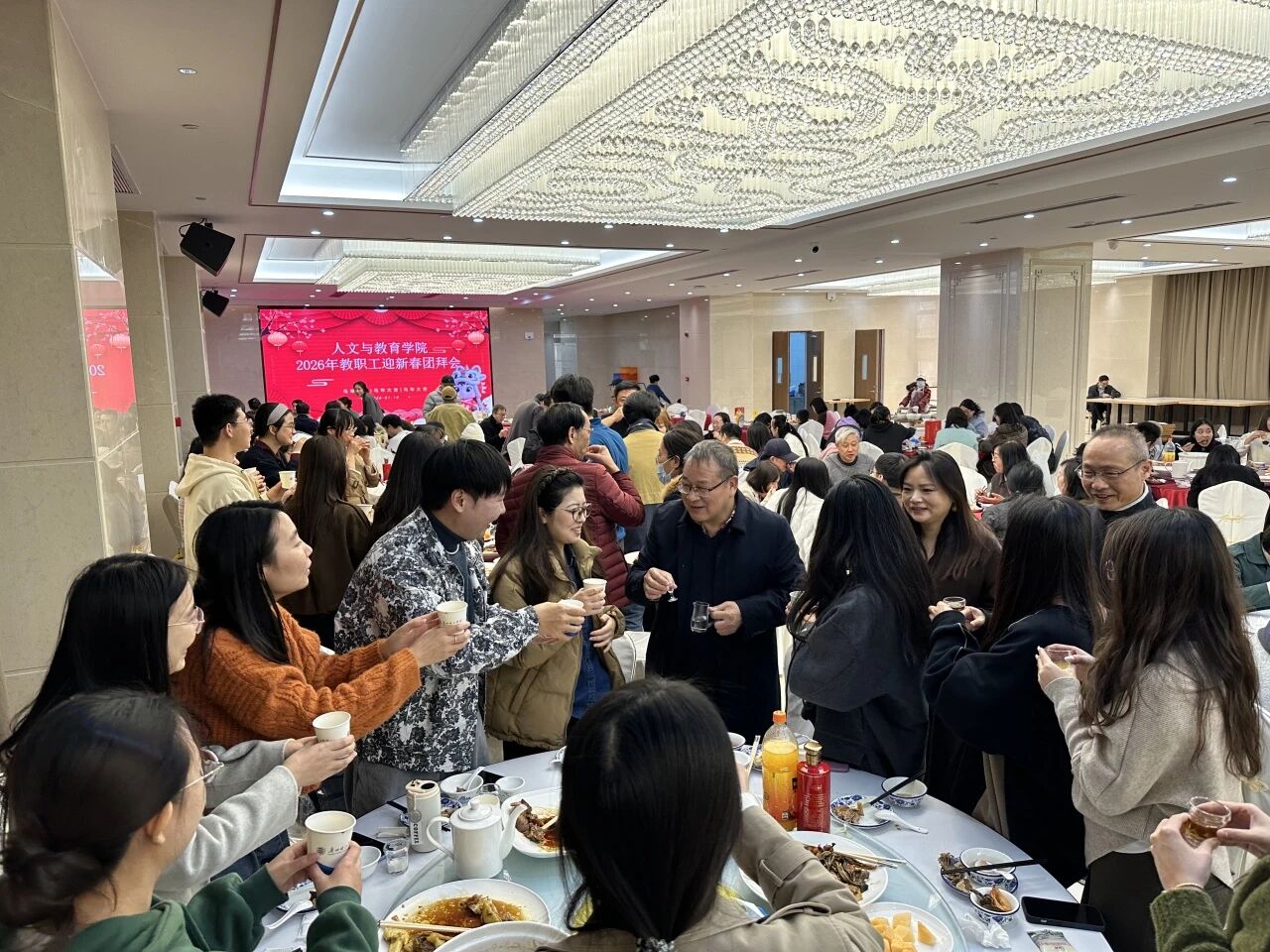 2026年1月10日,人文与教育学院于学术交流中心举行全体教职工年终团建活动暨迎评冲刺工作动员大会。学院院长陈南先、党总支书记陈武耕、副院长韩艳洁、党总支副书记陈新喜、教授代表张学松及学院全体教职工共220余人齐聚一堂,共话发展、共庆佳节、共迎挑战。