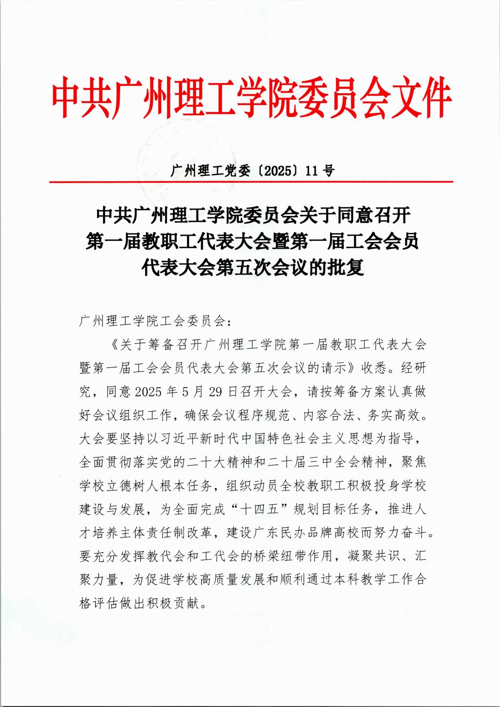中共广州理工学院委员会关于同意召开第一届教职工代表大会暨第一届工会会员代表大会第五次会议的批复